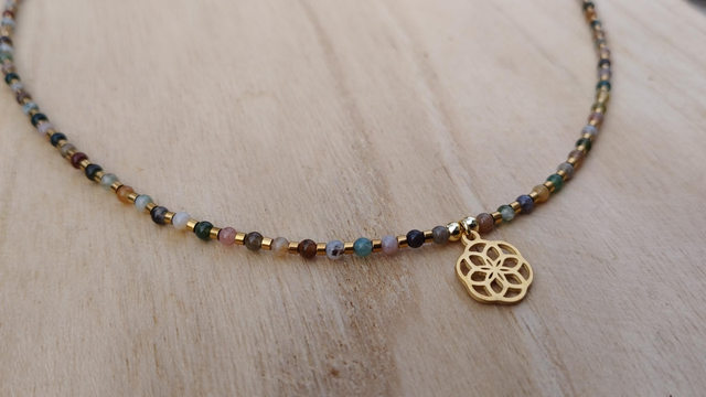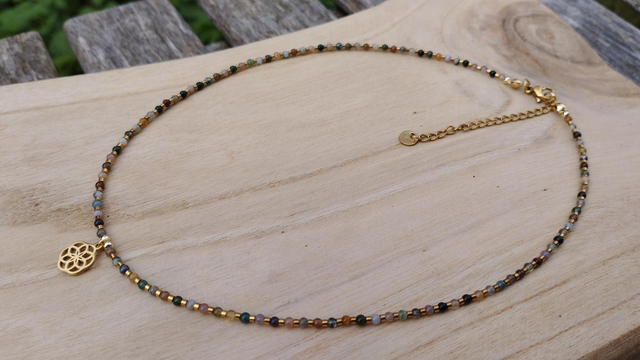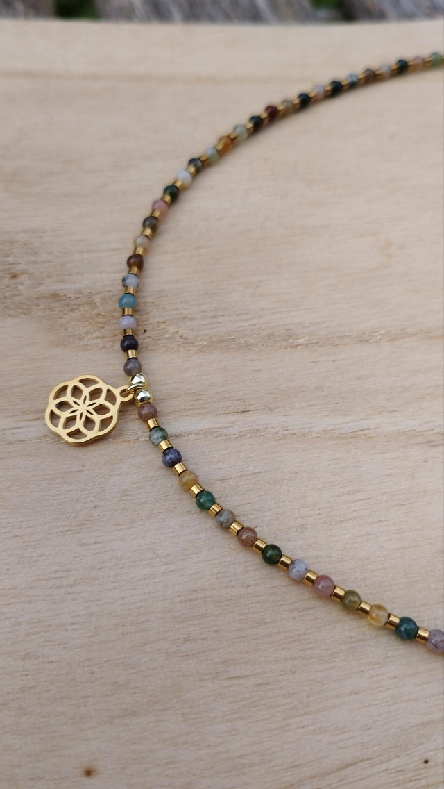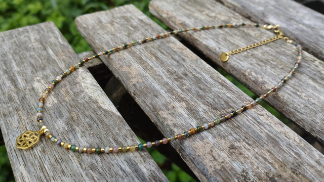 Collier fin en pierres minérales naturelles d'Agate Indienne, et perles d'espacement en Hématite. Perles de 2 mms. Fermoir et autres en acier inoxydable plaqué or.